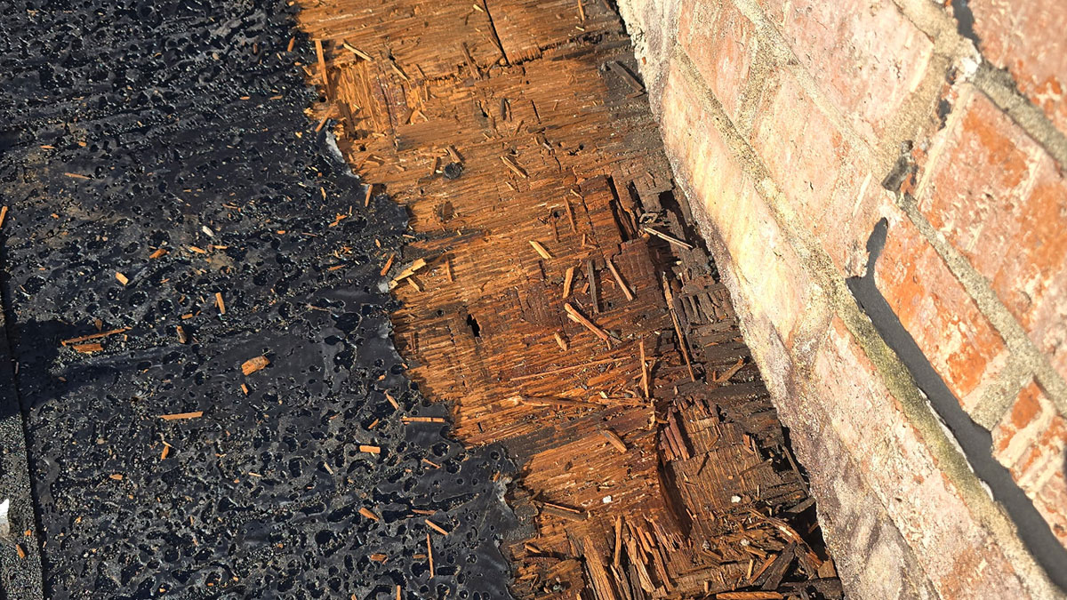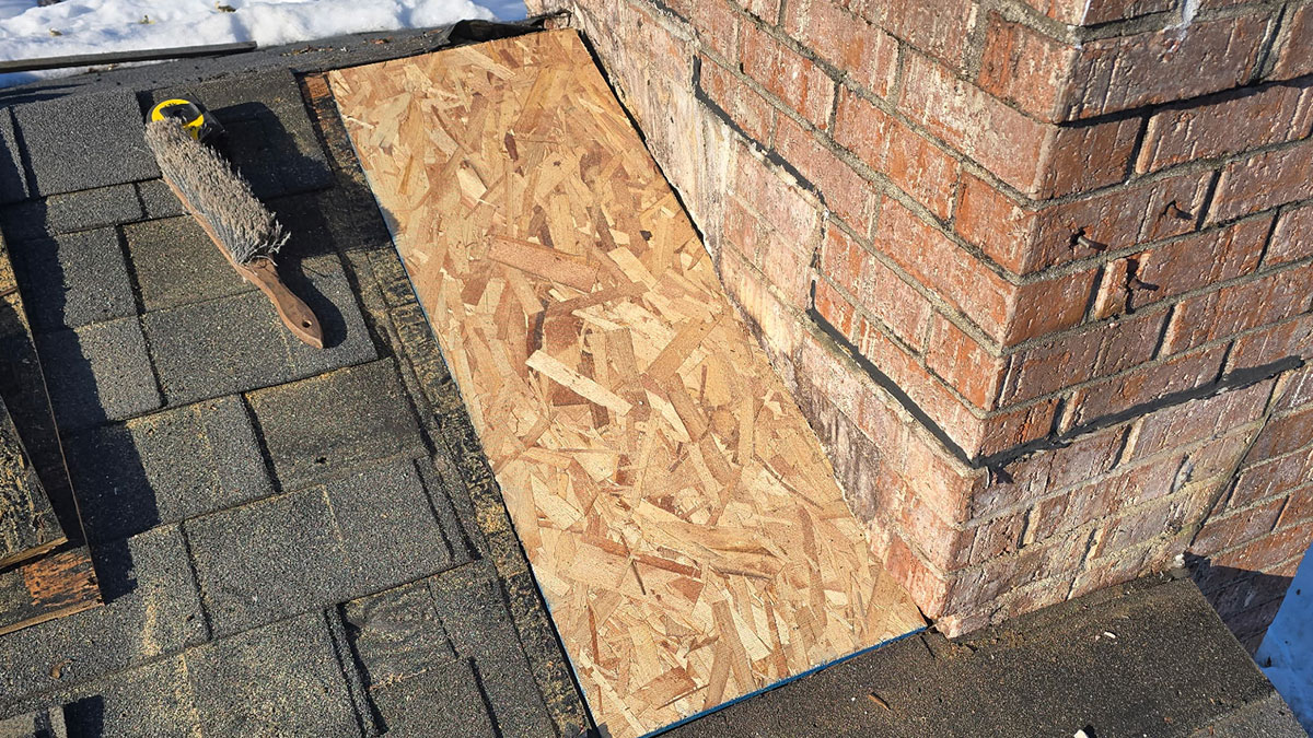 This Muskego, WI home required replacement of the chimney’s upper and lower flashing after rotted roof sheathing was discovered beneath the shingles. All damaged wood was removed and replaced, and a new double flashing system was installed on both the top and lower sections of the chimney to create a watertight seal. This repair restored the roof’s structural integrity and helps prevent future water intrusion.