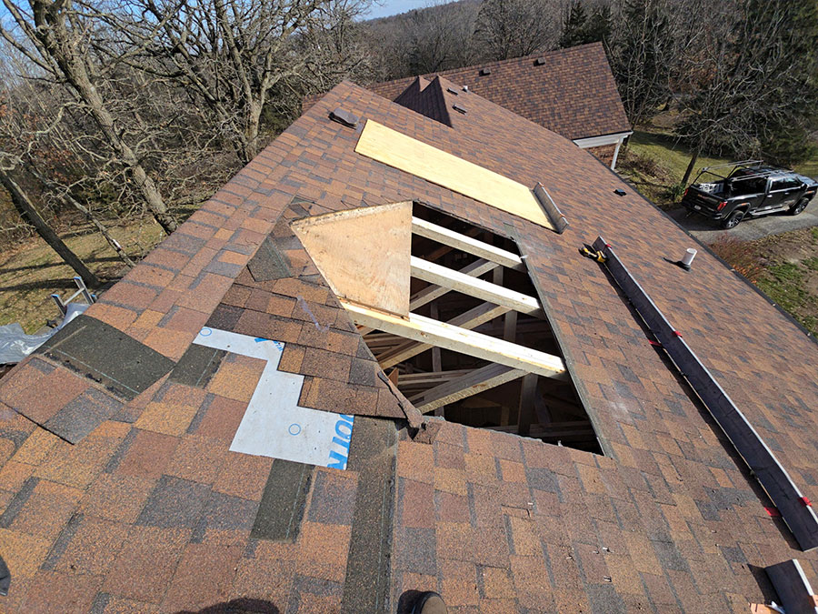 For this project, we were tasked with the complete removal of an existing chimney and flue system, spanning from the roof all the way down to the basement. Our team used scaffolding to access the roof safely and effectively.