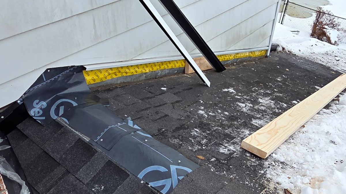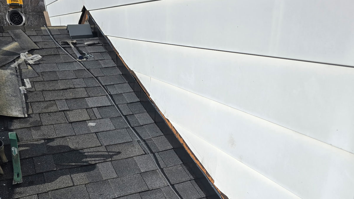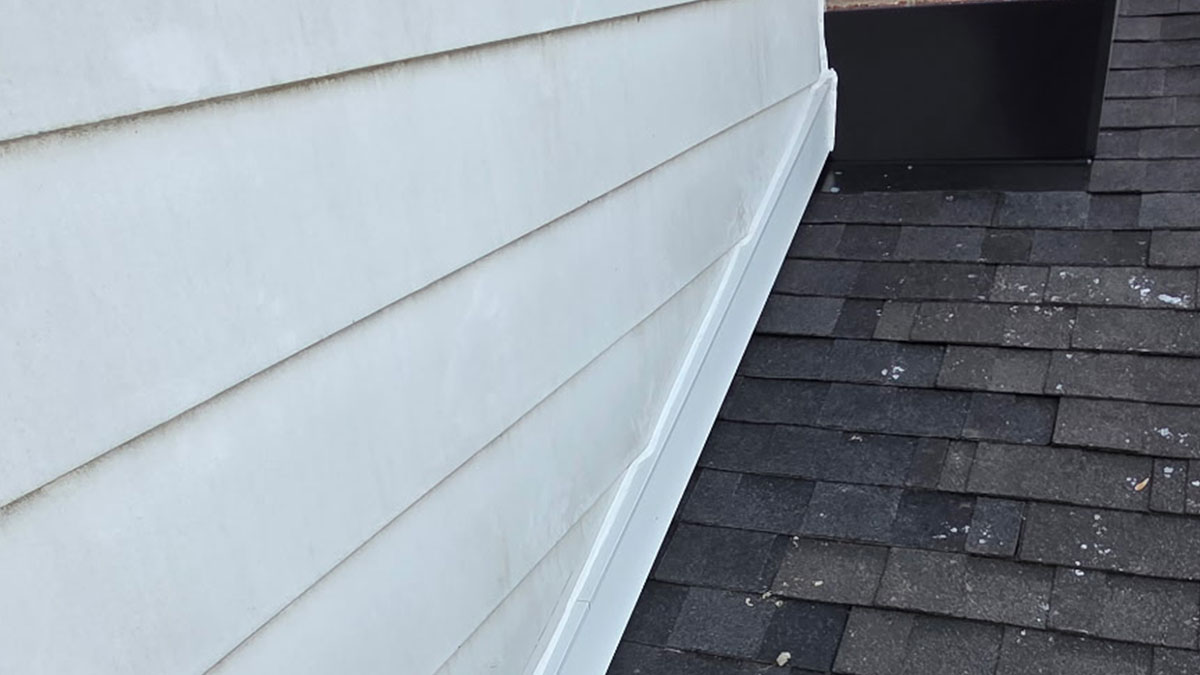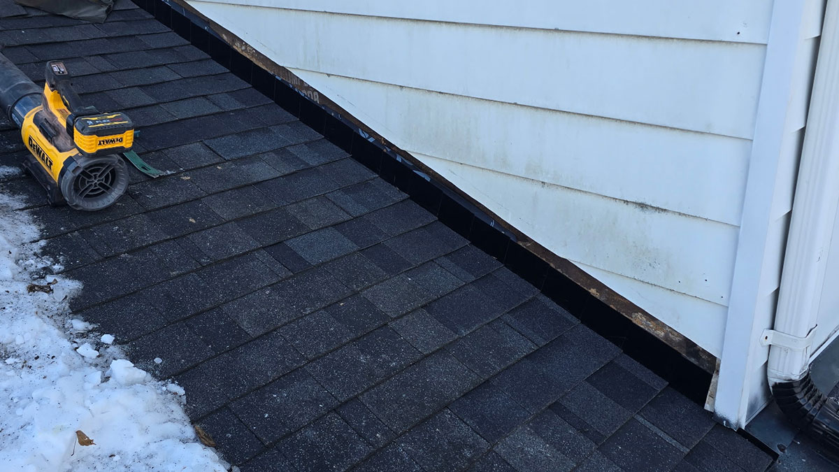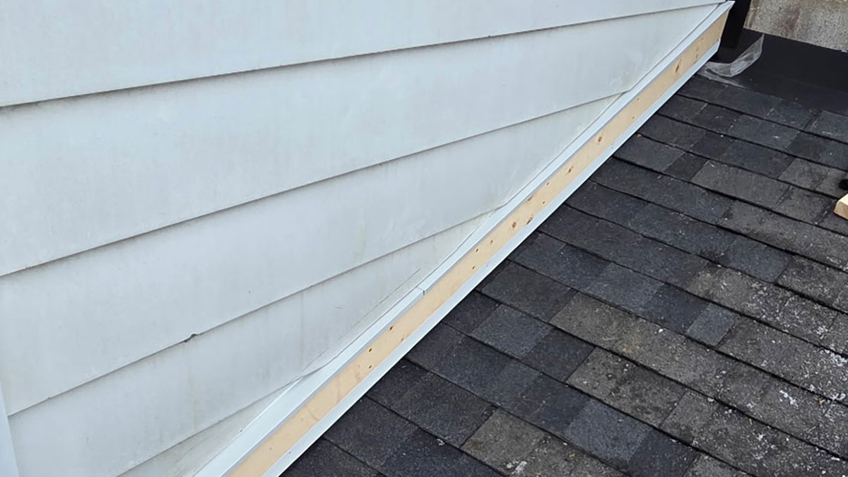 Fox River replaced the existing flashing and installed new trim board along the roofline with proper spacing from the siding and shingles. Siding and surrounding shingles were carefully cut back to inspect for any rotted wood, and new step flashing with matching shingles was installed as needed, along with ice and water shield. All trim was sealed and caulked, and debris was hauled away upon completion. (Homeowner to supply paint or stain.)